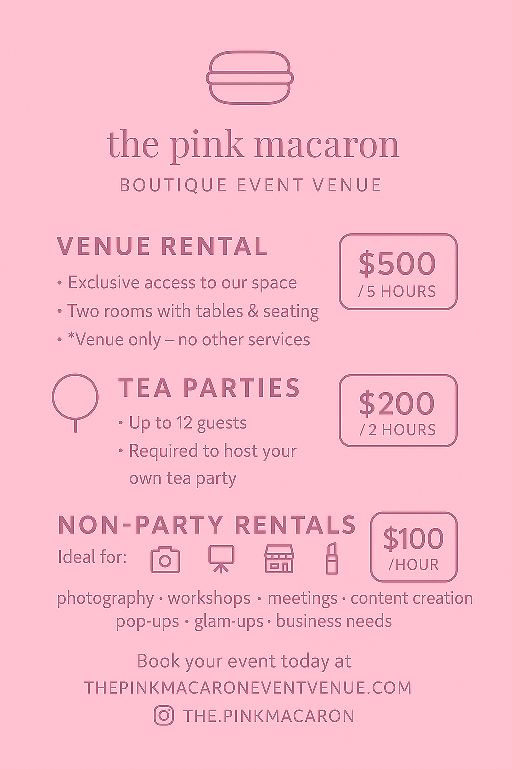Our iconic pink building sets the tone before you even step inside, where vibrant pink details bring your vision to life. Beyond private events, The Pink Macaron is a versatile space ideal for photo shoots, pop-up shops, workshops, and business gatherings.